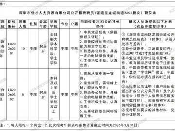 深圳市优才人力资源有限公司2026年3月招聘党政事务辅助岗、专业技术岗,一共3人,派遣至深圳市龙岗区教育局工作。完整公告详见正文。